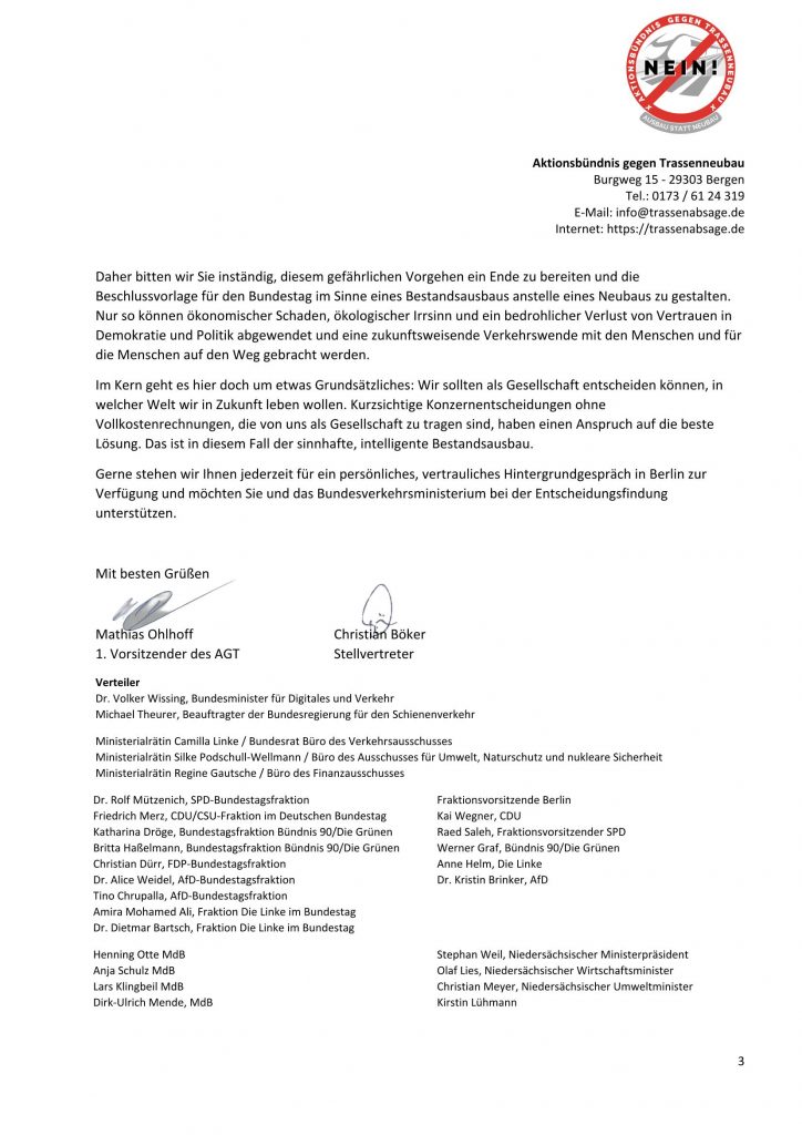 Der Widerstand in der Bevölkerung gegen den möglichen Neubau einer ICE-Strecke durch die Heide ist ungebrochen: Das Aktionsbündnis gegen Trassenneubau (AgT) hat mit einer Online-Petition und analogen Listen über 25.000 Unterschriften gesammelt, die dies unterstreichen. Dieses Ergebnis wird nun dem Bundesverkehrsminister Volker Wissing und weiteren, relevanten Akteur:innen zusammen mit einem Offenen Brief zugesandt werden.